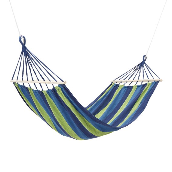 To hamak, przeznaczony do zawieszenia np. między dwoma drzewami. Łatwy w montażu, wszystkie niezbędne przybory, znajdują się w zestawie. Już po kilku chwilach, będziemy mogli oddać się, błogiemu odpoczynkowi. Drewniana belka o długości 70 cm, umieszczona w hamaku jako wzmocnienie sprawia, że materiał nie będzie się naciągał, przez co jego sprężystość będzie cały czas na takim samym, wysokim poziomie. Dzięki temu, będziemy odczuwali komfort użytkowania, przez wiele sezonów. Hamak idealnie dopasuje się naszego ciała, a szerokość aż 100 cm gwarantuje każdemu, znalezienie wygodnej pozycji. Materiał hamaka, to poliester oraz przyjemna, gęsto pleciona bawełna. Takie połączenie, daje bardzo wysoką wytrzymałość oraz odporność, na jakiekolwiek odkształcenie.